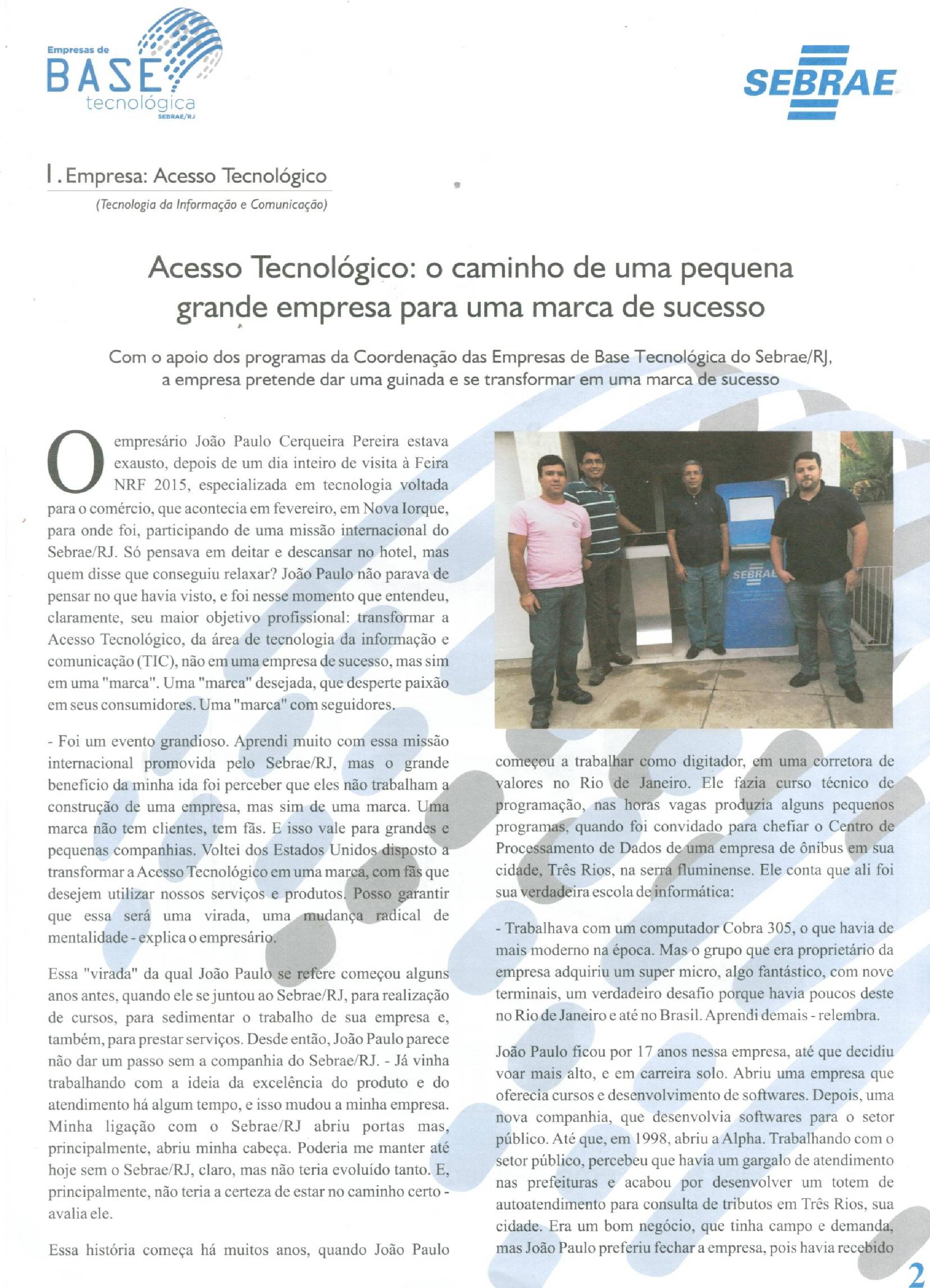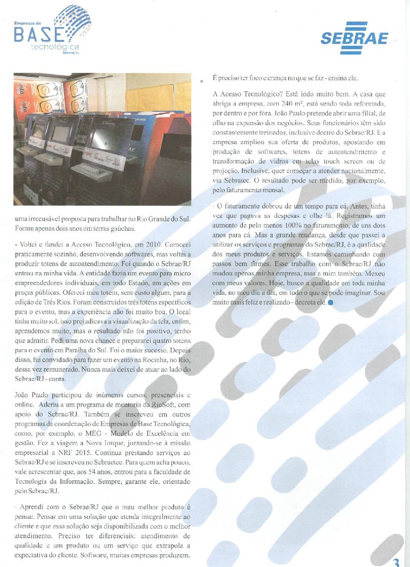 Ajudando no desenvolvimentos e planejamento do site "Capacitação e Treinamento" com gravações de palestras e cursos, trasmissão ao vivo em redes sociais, totens, controle de credenciamentos e RFID e estamos qualificados para criação de soluções tecnológicas junto a Coordenação das Empresas de Base Tecnológicas SEBRAE RJ